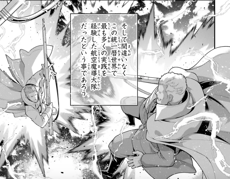 一方で、地上捜索隊として任じられたヴァイスたちの元には「円卓」の一人であるグリフォンが迫ります。ターニャ達の圧倒的な強さのせいでアルビオン連合王国の魔術師は帝国の魔術師に比べて押し並べて一ランク下の印象があり、「円卓」も帝国のネームド級より格下と思っていたのですが、このグリフォンは「吟遊詩人」とつばぜっていたほどの実力者なのだと言います。